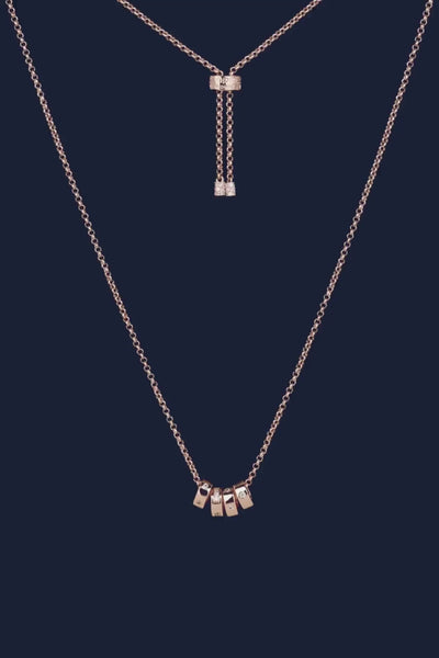 This necklace made with APM Alloy and 18k rose gold plated is microset with white cubic zirconia to form the words LOVE in Morse Code secret language.