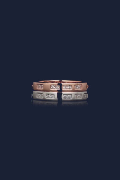 These rings are handcrafted from sterling silver and paved with white cubic zirconia. They are microset with white cubic zirconia to form the words TOI MOI in Morse Code secret language. The meaning is also engraved inside.