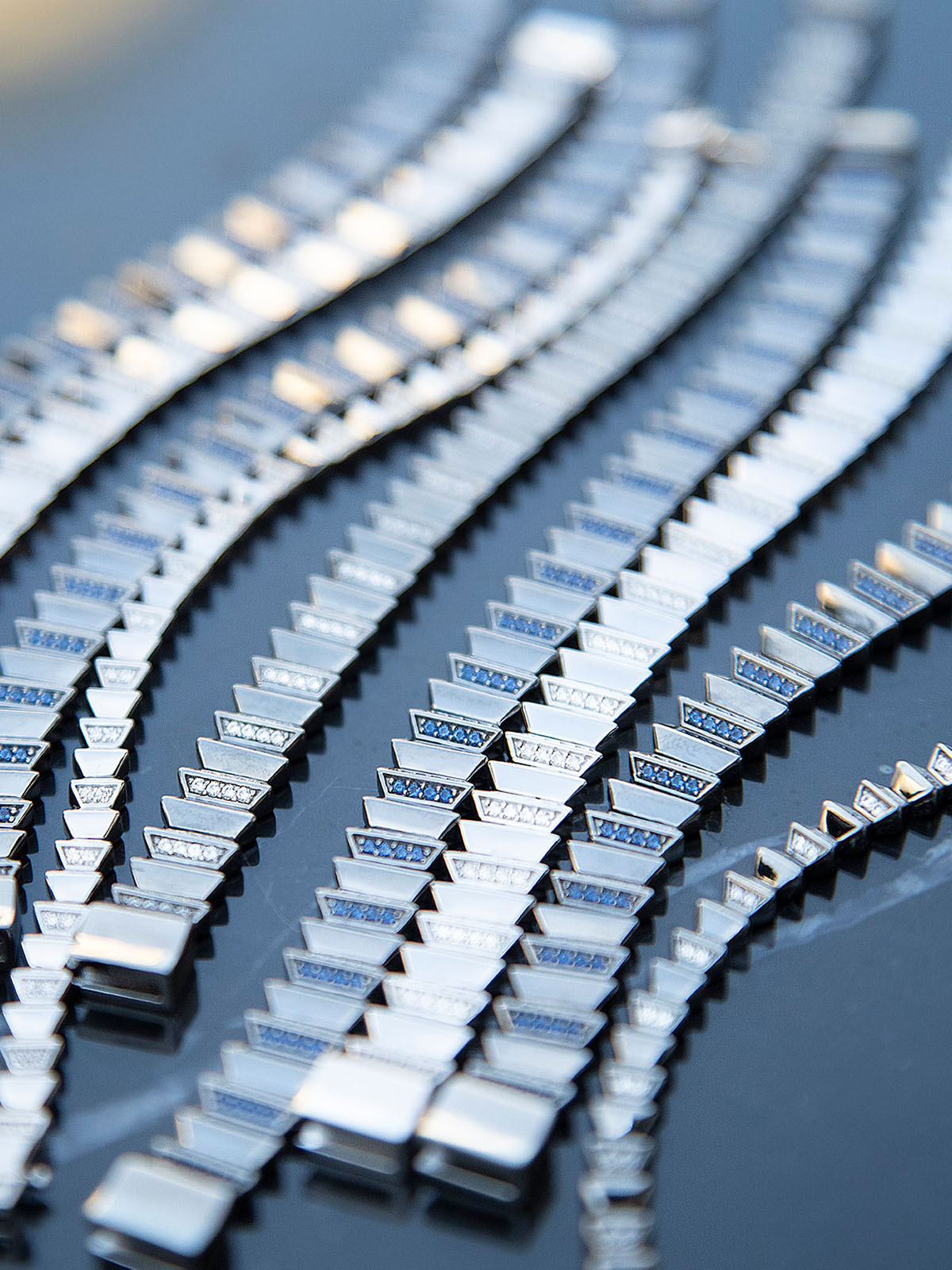 Bracelet with geometric design and blue stones on a white background