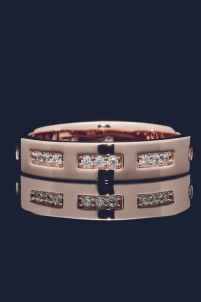 This ring is made with APM Rose Alloy and 18k gold plated layer of 3 microns. It is microset with white cubic zirconia.