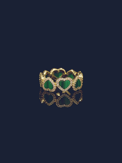 这款戒指用APM合金和表面一层3微米的18k金制成,微镶了白色合成立方氧化锆,并配以孔雀石。