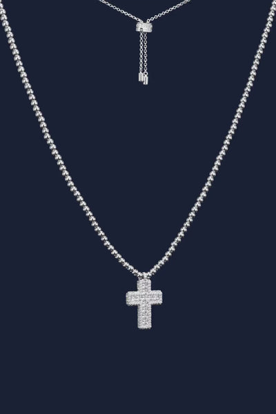 密镶十字架可调节银珠项链