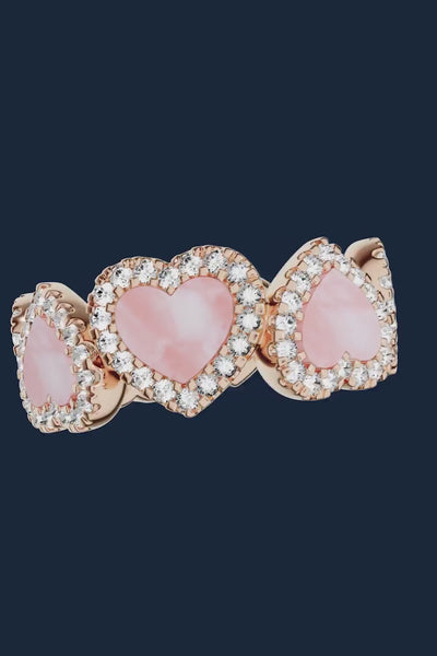 这款戒指用APM的玫瑰合金和和表面一层3微米的18k金制成,微镶了白色氧化锆石,并配以粉母贝。