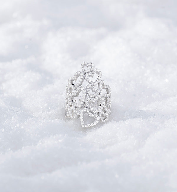 匠心工艺纯手工打造,以数百颗闪锆镶嵌,精巧呈现雪花的晶莹与灵动,这款戒指从日间的简约优雅,轻盈过渡至夜晚的华美璀璨,时刻诠释着精致、优雅与型格。